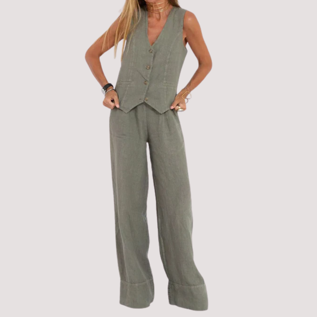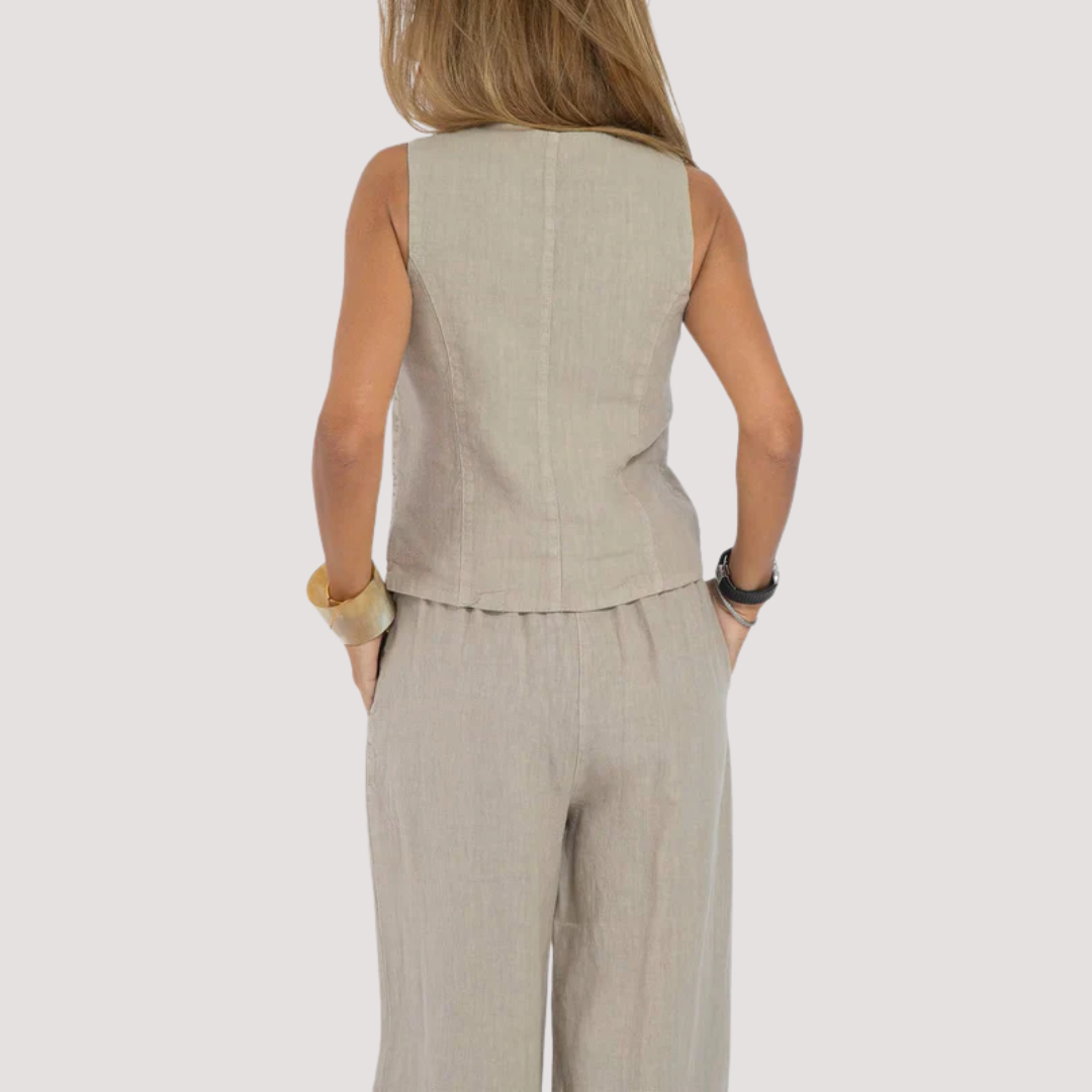 ¿Buscas un look que sea elegante y cómodo, sin complicaciones? El Conjunto Katja es tu nuevo favorito para los días soleados. Este conjunto de lino ligero está hecho de lino puro, una tela natural que respira, cae con suavidad y siempre tiene un aspecto elegante. La combinación de un chaleco estiloso con cierre de botón y un pantalón holgado y amplio te da ese toque effortless que se adapta a cualquier ocasión, desde la terraza, un día en la oficina hasta una cena. Ya sea que lo uses como conjunto completo o combines las prendas por separado con tus básicos favoritos: Katja se puede estilizar fácilmente y sigue siendo relevante temporada tras temporada.
