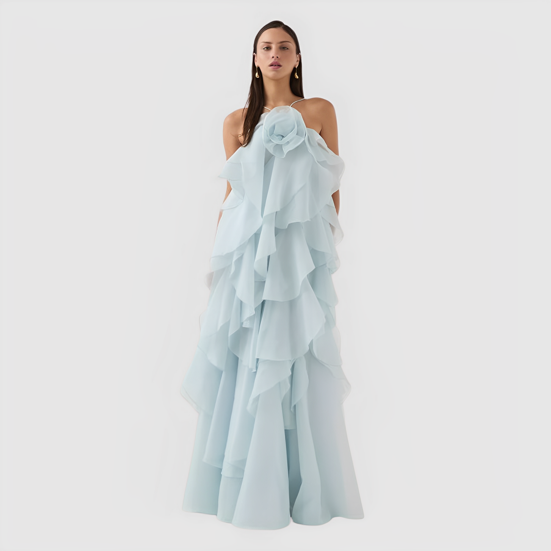 Su cuello halter se ajusta con elegancia, dejando los hombros desnudos, mientras una flor delicada enmarca el escote como un detalle encantado. La silueta se alarga en un corte fluido y romántico que acaricia el suelo, como si cada paso tocara el mar.