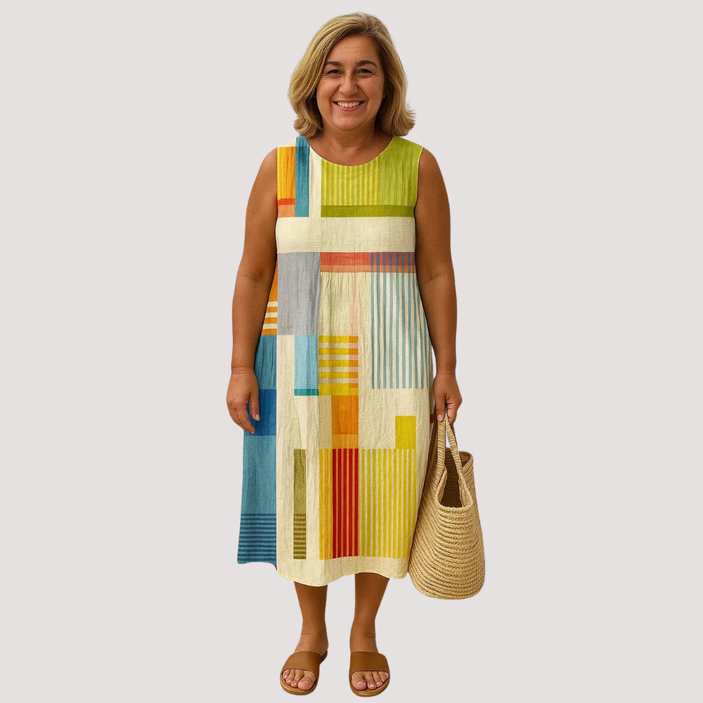 La Adriana™ es un vestido moderno que combina bloques de color y líneas artísticas en un diseño único y atrevido. Su corte amplio y sin mangas te brinda frescura y libertad, con un estilo que transmite creatividad y alegría.